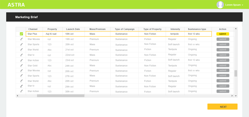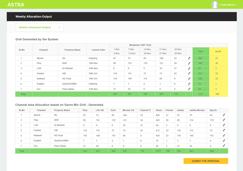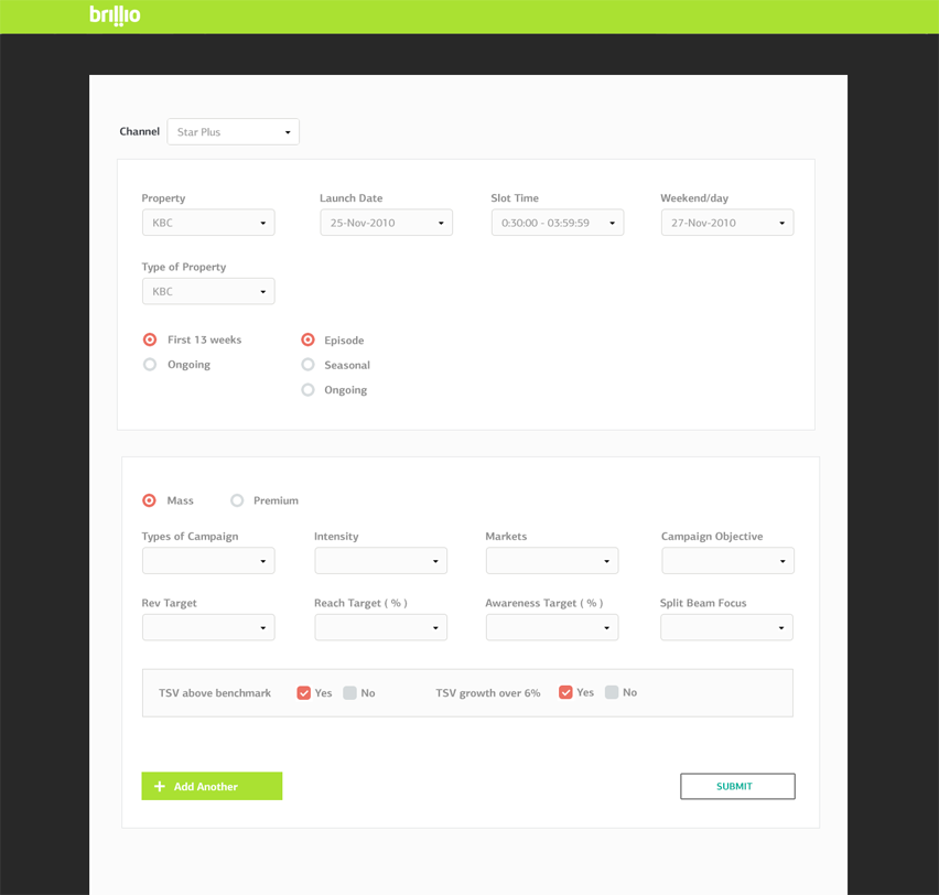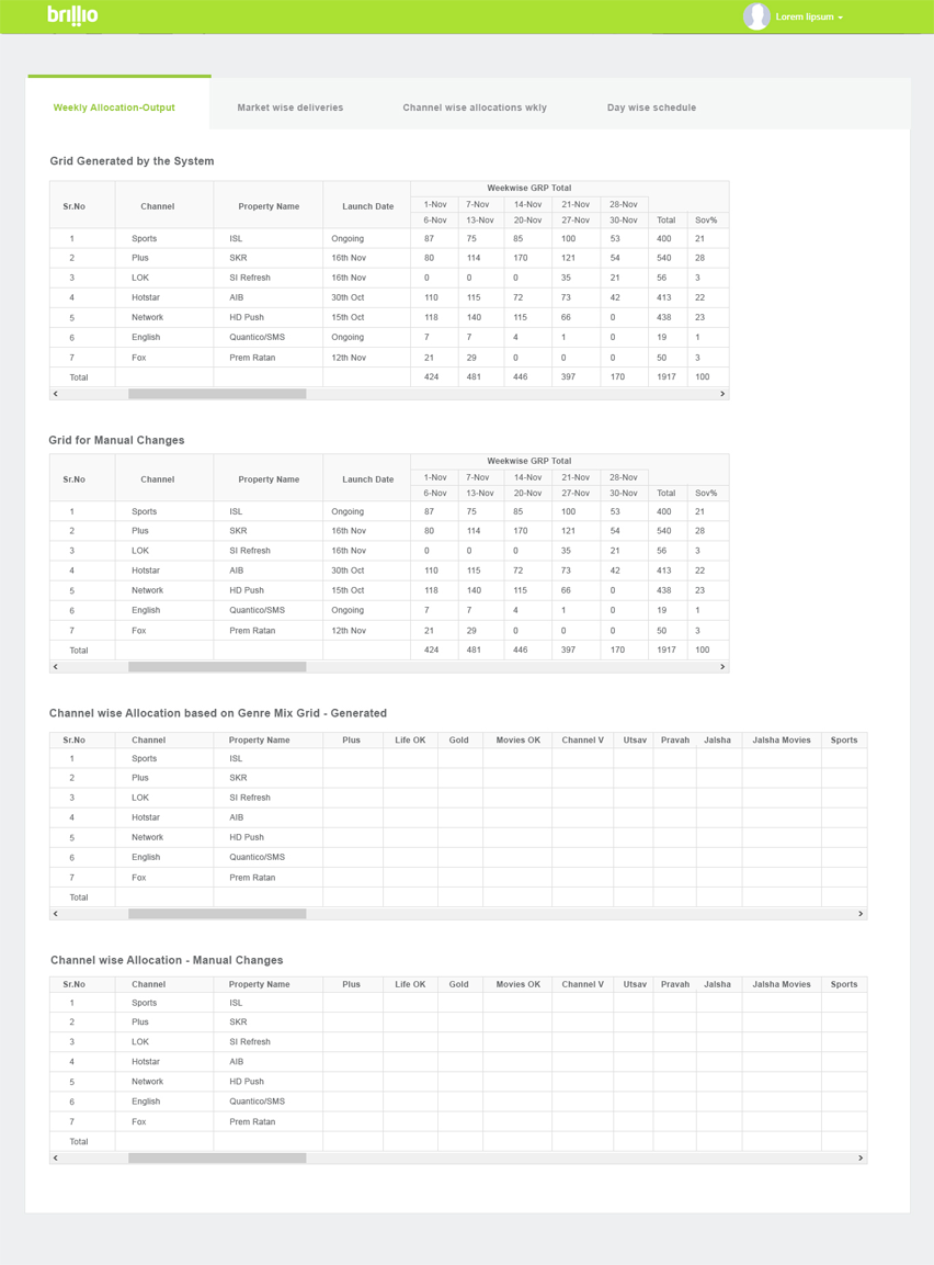 This is an APP for Network Promo. Its a Prmomoplanner optimiser, to create weekly plans for promoting TV shows on network channels. Its designed to deliver (GRP) Gross Rating Points and achieve promo GRP burn target. Allows user to re-plan and adjust airing & GRP burn. Controls airing of time bound creatives like showing today, tomorrow. My Role Wureframe, VD and Front end development.