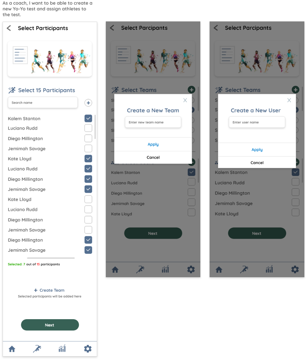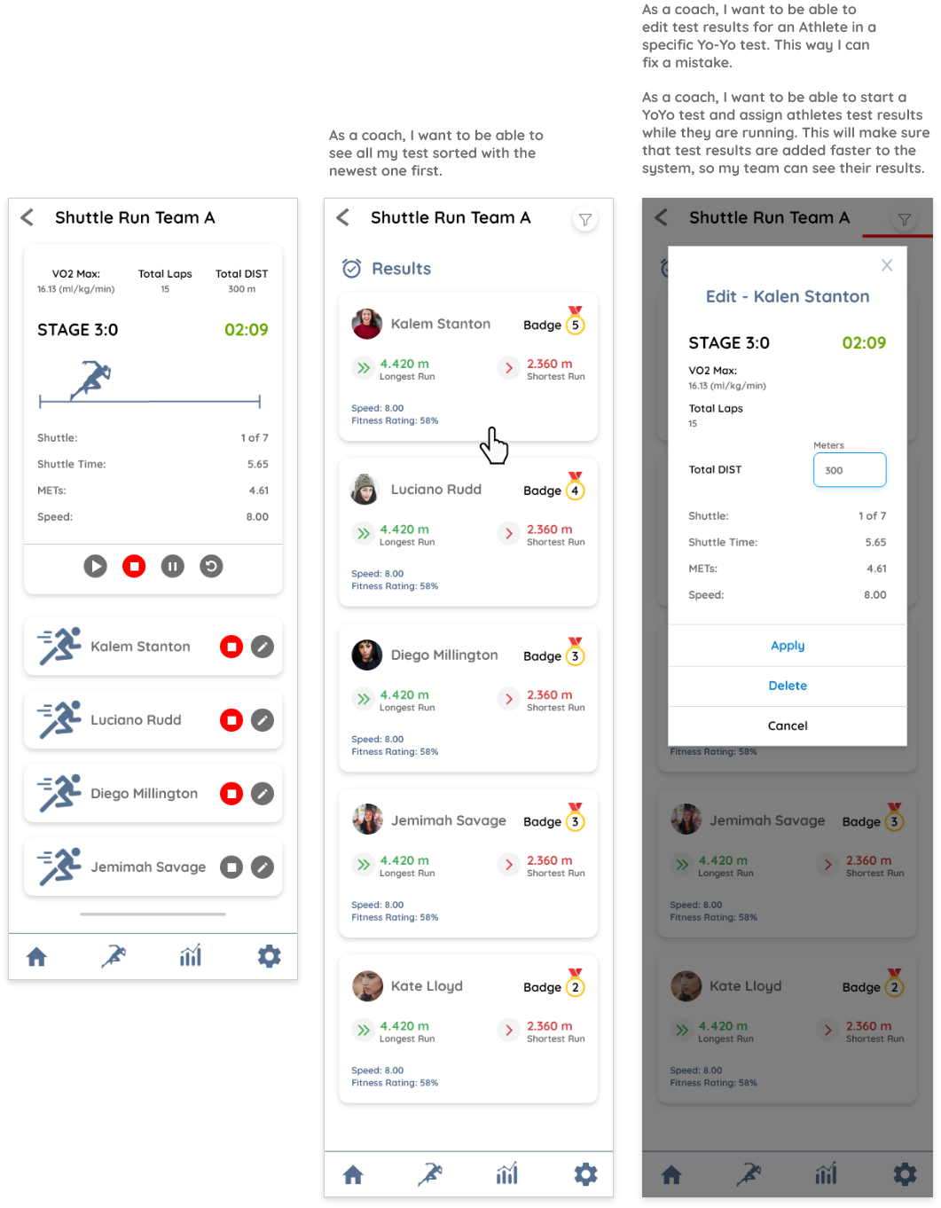 The app will help coaches entering results fast and easy for a Yo-Yo test (It is also known as the 20-meter shuttle run test, beep test or bleep test among other names). The app is meant to be used by coaches working with athletes. The app should ease the task of creating and assign athletes to a Yo-Yo test and also help the Coach entering test results for a Yo-Yo test. It should be possible for a coach to do this in real-time, meaning while the Yo-Yo test is ongoing and having around 15 athletes doing the Yo-Yo test at the same time.