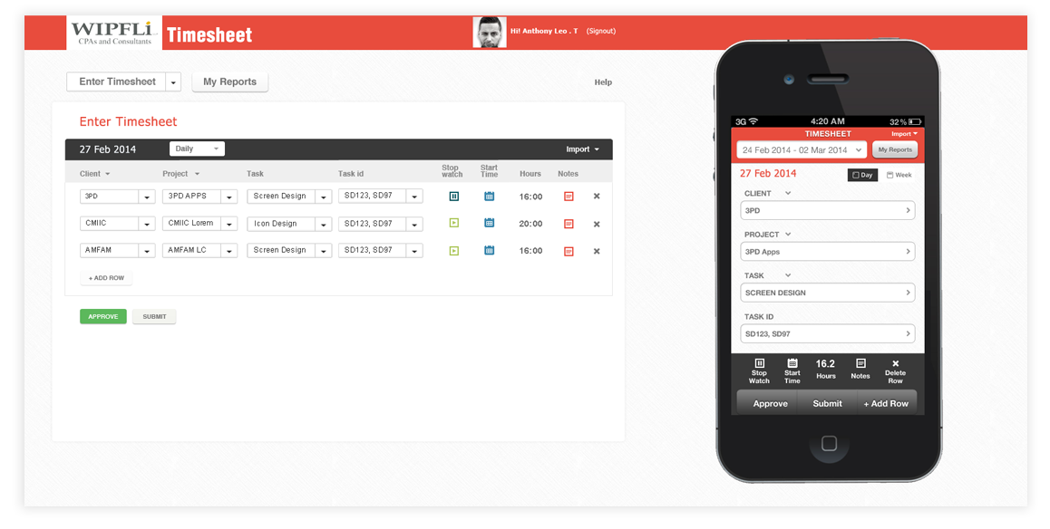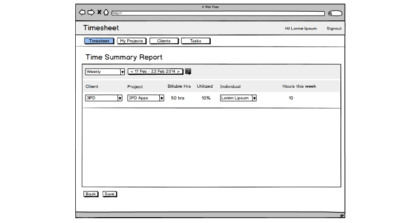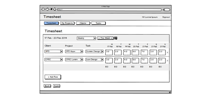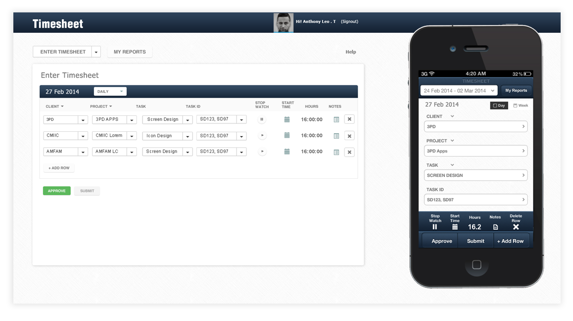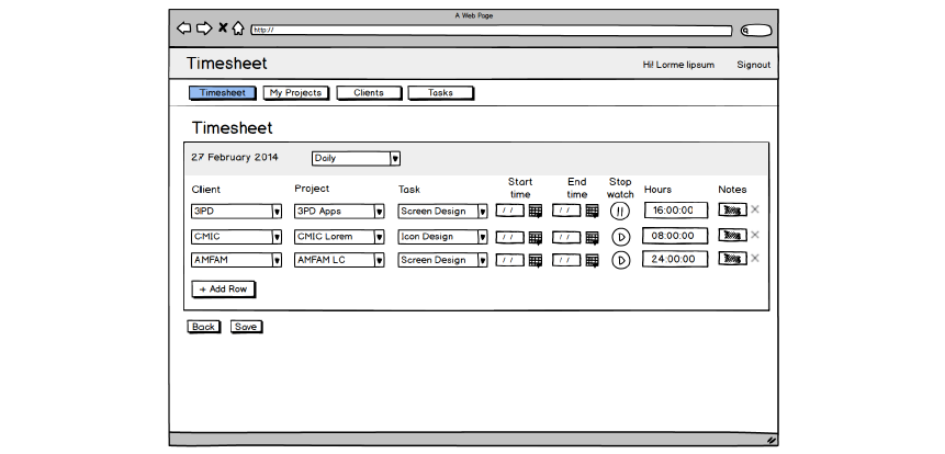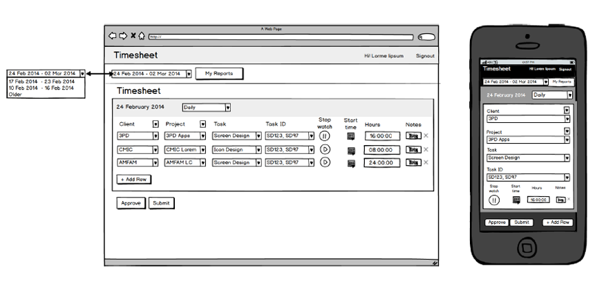 This is a in house Time Tracker APP. My Role wireframes, VD and make it responsive.